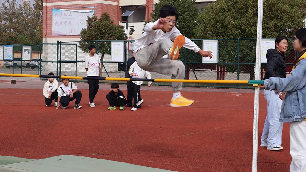 随着发令枪响,各项赛事紧张有序展开。跑道上,短跑运动员如离弦之箭般冲出起跑线,双臂急促摆动,脚步声清脆有力,你追我赶的激烈角逐让观赛师生屏息呐喊;长跑赛道上,选手们凭借坚韧毅力稳步前行,汗水浸透衣衫却始终目光坚定,用脚步丈量坚持的意义。田赛场上同样精彩纷呈,跳高运动员助跑、起跳、腾空,身姿舒展如雄鹰展翅,一次次越过更高横杆;跳远选手蓄力冲刺,蹬地起跳后在空中划出优美弧线,稳稳落入沙坑溅起细碎沙粒;投掷区里,运动员紧握实心球,腰部发力、手臂前挥,将器械奋力投出,抛物线承载着拼搏的渴望。4×100米接力赛更是点燃全场热情,四名队员默契配合,接力棒的传递不仅是速度的衔接,更是团结与信任的传承,每一次交接都引来全场欢呼。